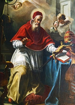 • 성인은 의자에 앉아 한 손에는 문서를 들고 다른 손에는 작은 책을 쥐고 있어 교회의 가르침과 교황의 통치 권위를 상징한다.