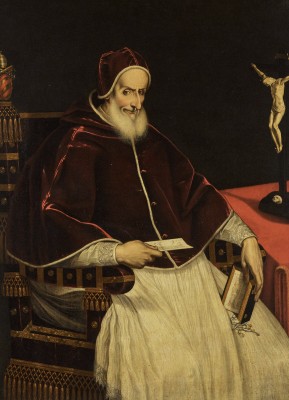 ※ 이 작품은 후기 르네상스 시기의 교황 초상화 전통 속에서 제작된 작품으로, 시피오네 풀초네 공방 특유의 사실적 묘사와 절제된 구도를 통해 교황 성 비오 5세의 권위와 내적 경건을 동시에 드러낸다. 작가는 어두운 배경 위에 떠오르는 붉은 모제타와 흰 의복의 강한 색채 대비를 활용하여 인물을 화면의 중심으로 집중시키고, 손에 든 문서와 책을 통해 교회의 가르침을 수호하고 통치하는 교황의 사명을 상징적으로 표현한다. 또한 옆에 놓인 십자가상은 교황의 권위가 단순한 제도적 권력에 머무르지 않고 그리스도의 수난과 복음에 대한 봉사에서 비롯된다는 의미를 시각적으로 강조한다. 이러한 구성은 르네상스 말기 교황 초상화가 지닌 기록성과 상징성을 함께 보여주며, 성 비오 5세를 교회의 개혁과 신앙 수호를 위해 헌신한 영적 지도자의 모습으로 제시한다.