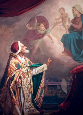 ※ 이 작품은 근대 가톨릭 종교화 전통 속에서 성 비오 5세와 묵주기도 신심을 연결하여 표현한 환시 장면의 성화이다. 작가는 무릎을 꿇고 묵주를 들고 기도하는 교황을 화면의 중심에 두고, 뒤편에 성모 마리아를 구름 위에 나타나게 하여 하늘과 인간 세계가 만나는 영적 장면을 구성한다. 이러한 상하 구도와 빛의 표현은 근대 종교화에서 자주 사용되는 시각적 장치로, 기도와 은총의 관계를 상징적으로 드러낸다. 화면 한편에 묘사된 바다 전투 장면은 1571년 레판토 해전을 암시하며, 교황이 전 교회에 묵주기도를 권고했던 역사적 사건을 시각적으로 연결한다. 이 성화는 교회의 승리가 단순한 군사적 결과가 아니라 성모의 전구와 신자들의 기도에서 비롯된 은총의 사건이라는 신앙적 이해를 강조하며, 묵주기도가 교회의 공동 기도와 신앙을 결집시키는 영적 힘임을 보여준다.