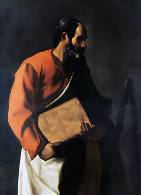 작가 : 프란시스코 데 수르바란 (Francisco de Zurbarán) 연대 : 1633년 소장 : 소장처 미상 기법·시대 : 유채, 스페인 바로크 유형 : 사도 단독상 특징 : • 짙은 어둠 속에서 인물을 반신상으로 배치하여 강한 집중 효과를 형성한다. • 붉은 상의와 흰색 하의의 대비가 화면에서 인물의 존재를 또렷하게 드러낸다. • 두 손으로 커다란 책을 감싸 안고 있으며, 곤봉은 옆에 세워져 순교의 상징을 암시한다. • 빛은 얼굴과 손, 책의 표면에 집중되어 물질적 질감과 육체적 현실감을 강조한다. ※ 이 작품은 수르바란 특유의 절제된 테네브리즘을 통해 성인을 장엄한 영웅이 아니라 침묵 속에 서 있는 인간으로 제시한다. 작가는 장식과 배경을 배제하고, 빛과 어둠의 극단적 대비를 통해 인물의 고독과 내적 집중을 부각한다. 두 손으로 감싸 안은 책은 말씀에 대한 충실함을, 곁에 놓인 곤봉은 순교의 정체성을 조용히 드러낸다. 이 성화에서 신앙은 외적 드라마가 아니라, 고독한 자리에서 책임을 붙드는 태도로 제시되며, 어둠 속의 빛은 그 선택이 하느님을 향해 정렬되어 있음을 암시한다.