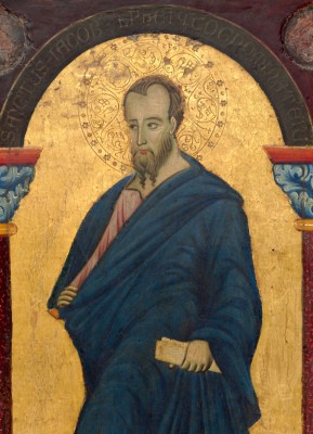작가 : 성 프란치스코의 대가(Master of Saint Francis) 연대 : 1272년경 소장 : 워싱턴 국립미술관(National Gallery of Art, Washington) 기법·시대 : 템페라와 금박, 목판, 이탈리아 후기 비잔틴·프로토 르네상스 유형 : 사도 단독 패널화 특징 : • 금박 배경과 장식된 후광이 초월적 공간을 형성한다. • 인물은 정면에 가까운 자세로 배치되어 정적이고 상징적인 구도를 이룬다. • 깊은 청색 망토와 단순화된 얼굴 표현은 상징성을 강조한다. • 손에 쥔 두루마리는 사도의 가르침과 교회의 전승을 암시한다. ※ 이 작품은 이탈리아 13세기 회화가 비잔틴 전통을 계승하면서 점차 인간적 표현으로 이행하는 과도기적 성격을 보여준다. 작가는 평면적 금박 배경과 엄격한 정면성을 유지하여 성인의 초월적 위상을 강조하는 동시에, 얼굴의 미묘한 표정과 옷 주름을 통해 인물의 존재감을 강화한다. 두루마리는 단순한 소품이 아니라 교회의 신앙 전승을 상징하며, 화면 전체는 역사적 인물의 서사보다 영원의 질서 속에 참여하는 성인의 상태를 드러낸다. 이 성화에서 신앙은 감정의 표현이 아니라 교회의 기억 안에 보존된 고백과 전승의 형식으로 제시된다.