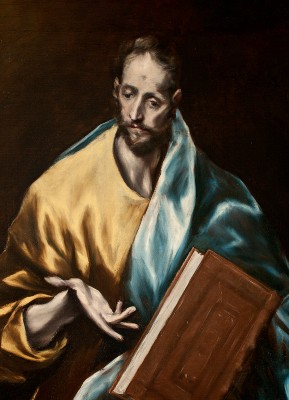 작가 : 엘 그레코 (El Greco, 도메니코스 테오토코풀로스) 연대 : 1610–1614년경 소장 : 스페인 톨레도 엘 그레코 미술관(Museo del Greco, Toledo) 기법·시대 : 유채, 스페인 후기 르네상스·마니에리스모 유형 : 사도 단독상 특징 : • 어두운 배경 위에 인물을 반신상으로 배치하여 인물의 존재를 강조한다. • 길게 늘어진 얼굴과 가는 손은 엘 그레코 특유의 왜곡된 비례를 보여준다. • 황색 의복과 청색 망토의 대비가 인물의 영적 긴장을 강화한다. • 한 손에는 두꺼운 책을 들고 있으며, 다른 손은 설명하듯 펼쳐져 있다. ※ 이 작품은 엘 그레코 후기 양식의 특징을 반영하여, 자연주의적 재현보다 영적 표현을 우선한다. 작가는 인체 비례를 의도적으로 길게 변형하고, 색채를 상징적으로 대비시켜 인물의 초월적 지향을 강조한다. 책은 교회의 가르침과 사도의 권위를 상징하며, 펼쳐진 손은 신앙의 증언과 전달의 행위를 암시한다. 이 성화에서 신앙은 안정된 균형이 아니라, 하느님을 향해 끌려 올라가는 내적 상승의 움직임으로 제시되며, 형상의 왜곡은 그 영적 긴장을 시각적으로 구현한다.