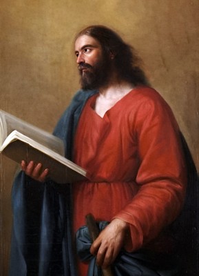 작가 : 안토니오 마리아 에스키벨 (Antonio María Esquivel) 연대 : 19세기 중엽 소장 : 스페인 마드리드 낭만주의 미술관(Museo del Romanticismo, Madrid) 기법·시대 : 유채, 스페인 낭만주의 유형 : 사도 단독상 특징 : • 부드러운 황갈색 배경 위에 인물을 반신상으로 배치하여 안정된 구도를 형성한다. • 붉은 의복과 청색 망토의 색채 대비가 인물의 존재감을 또렷하게 드러낸다. • 한 손에는 펼쳐진 책을 들고 있으며, 다른 손에는 곤봉을 쥐어 사도이자 순교자의 상징을 함께 제시한다. • 시선은 화면 밖을 향해 약간 위로 향해 있어 사색과 내적 집중을 암시한다. ※ 이 작품은 19세기 스페인 낭만주의의 감성적 사실주의를 반영하여, 성인을 초월적 존재보다 인간적 사색가로 제시한다. 에스키벨은 극적인 명암 대비 대신 부드러운 색조와 세밀한 얼굴 묘사를 통해 인물의 심리적 깊이를 강조한다. 펼쳐진 책과 곤봉은 교회의 가르침과 순교의 정체성을 동시에 상징하며, 구성은 인물의 내면적 성찰에 시선을 집중시킨다. 이 성화에서 신앙은 영웅적 장엄함이 아니라, 말씀을 숙고하고 책임을 감당하는 사도의 인간적 응답으로 제시된다.