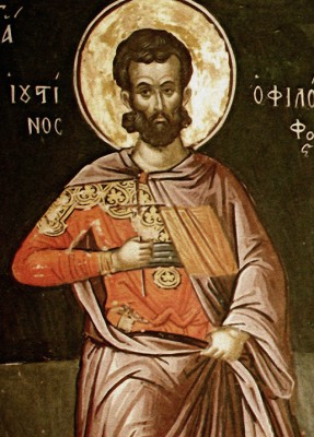상징 : 철학자의 외투(철학적 탐구), 두루마리·책(변증 저술), 종려가지(순교의 증언), 검(참수 순교)