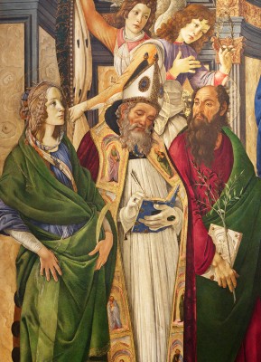 ※ 이 작품은 1487년 르네상스 피렌체 회화의 특징을 반영하여, 성인들을 조화롭고 질서 있는 인간적 공간 안에 배치한다. 보티첼리는 중세적 상징성에서 벗어나 인물 간의 관계와 내적 교류를 강조하는 구성을 통해, 신앙을 추상적 상징이 아니라 인간적 경험 속에서 드러나는 것으로 표현한다. 성 바르나바는 다른 성인들과 함께 화면 안에서 서로를 바라보고 연결되며, 이는 신앙이 개인의 고립된 행위가 아니라 공동체적 관계 속에서 형성됨을 시사한다. 이 성화는 15세기 르네상스의 인간 중심적 시각과 신앙의 조화를 보여주며, 하느님의 은총이 인간의 이성과 질서 속에서도 드러날 수 있음을 나타낸다.