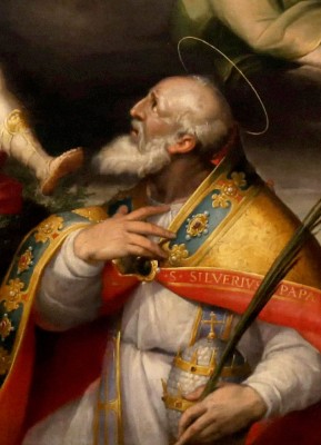 ※ 이 작품은 16세기 이탈리아 매너리즘 회화의 특징을 반영하여, 성 실베리오를 단순한 역사적 인물이 아니라 초월적 부름에 응답하는 존재로 제시한다. 사마키니는 인물의 시선을 위로 향하게 하고 손짓을 절제된 동작으로 표현함으로써, 외적 사건보다 내적 반응에 초점을 맞춘다. 화려한 제의와 섬세한 색채는 교회의 권위를 시각적으로 드러내면서도, 그 권위가 하늘을 향한 응답 속에서 형성됨을 암시한다. 이 성화에서 신앙은 권위의 표식이 아니라, 위로부터 오는 부름에 대한 조용한 수용과 응답의 태도로 표현된다.