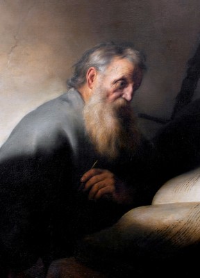※ 이 작품은 렘브란트 특유의 깊은 명암 대비와 절제된 구도를 통해 성 바오로를 극적인 사건의 인물이 아니라 묵상과 기록의 순간에 놓인 사도로 제시한다. 작가는 어둠 속에서 얼굴과 손에 떨어지는 빛을 통해 인물의 내적 사유와 영적 집중을 강조하며, 칼과 원고 묶음이라는 상징을 통해 순교와 가르침이라는 바오로의 사명을 함께 드러낸다. 이 성화에서 바오로는 설교의 장면보다 말씀을 기록하며 공동체를 돌보는 사도의 모습으로 나타나며, 신앙은 고요한 사유 속에서 형성되어 세상에 전해지는 진리의 책임으로 표현된다.