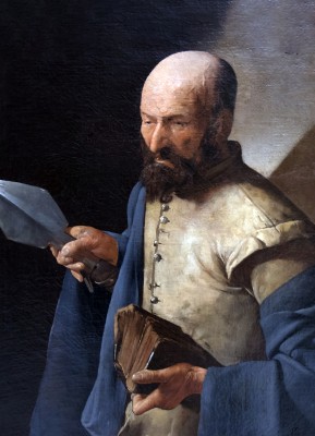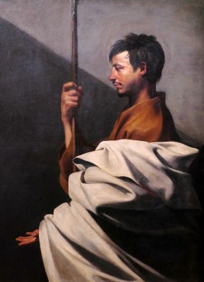 ※ 이 작품은 카라바조의 명암법을 계승한 리베라 특유의 사실주의를 보여주는 초기작으로, 사도를 이상화하지 않고 거친 현실의 인물로 제시한다. 강렬한 빛과 어둠의 대비는 신앙을 추상적 개념이 아니라 육체를 지닌 인간의 선택으로 드러내며, 창은 순교의 운명을 상징하면서도 이미 받아들여진 결단의 상징으로 기능한다. 리베라는 토마스를 극적 장면의 주인공이 아니라, 침묵 속에서 자신의 길을 응시하는 인물로 그려냄으로써, 신앙을 의심 이후에 형성된 단단한 결의의 상태로 제시한다. 이 성화에서 신앙은 고통을 피하는 힘이 아니라, 고통을 통과해 서 있는 인간의 굳은 자세로 표현된다.
