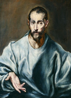 ※ 이 작품은 엘 그레코 후기 양식의 전형적 특징을 보여준다. 작가는 사도를 상징물 없이 단독으로 제시함으로써 외적 표지보다 내적 상태에 집중한다. 왜곡된 비례와 흔들리는 붓질은 육체의 안정감을 해체하고, 인물을 초월적 차원에 놓인 존재처럼 보이게 한다. 이 성화에서 신앙은 서사적 사건이나 상징의 명시가 아니라, 내면의 고독과 영적 긴장 속에서 드러나며, 성 야고보는 역사적 인물이기보다 빛과 그림자 사이에 놓인 영혼의 형상으로 재해석된다.