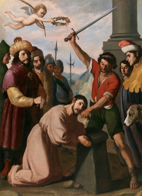 ※ 이 작품은 스페인 바로크의 엄격한 신앙성과 극적 사실주의를 결합한 전형적 예이다. 수르바란은 감정의 과잉을 피하면서도 결정적 순간을 정지된 장면처럼 제시하여, 순교를 비극이 아니라 영적 승리의 순간으로 해석한다. 천사의 월계관은 고전적 승리의 상징을 기독교적 영광으로 전환하며, 검의 사선과 인물의 수직적 자세는 죽음과 초월의 대비를 시각화한다. 이 성화에서 신앙은 고통을 넘어선 희망으로 드러나며, 성 야고보는 역사적 처형의 피해자가 아니라 하늘의 상을 받는 증인으로 형상화된다.