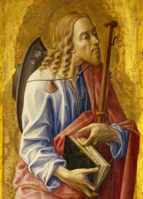 ※ 이 작품은 후기 고딕의 장식성과 초기 르네상스적 인물 표현이 공존하는 크리벨리 특유의 양식을 보여준다. 금박 배경은 현실 공간을 제거하고 성인을 초월적 차원에 배치하며, 선명한 윤곽과 세밀한 세공은 성인의 권위를 시각적으로 고정한다. 작가는 조개와 지팡이, 책이라는 상징을 정면에 배치하여 성 야고보의 정체성을 분명히 하면서도, 인물의 고요한 측면 시선을 통해 내적 묵상의 분위기를 형성한다. 이 성화에서 신앙은 역사적 여정의 인물이면서 동시에 영원한 차원에 속한 존재로 제시되며, 장식적 황금 공간은 그 영적 존엄을 드러내는 시각적 장치로 작용한다.