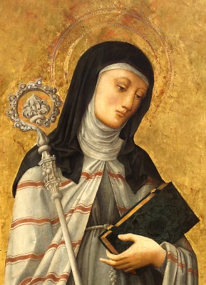 이 작품은 베네치아 지역 후기 고딕 전통 위에 초기 르네상스적 자연주의가 더해진 양식을 보여 준다. 금박 배경은 중세 제단화의 초월적 신학 공간을 유지하지만, 인물의 얼굴과 손에는 섬세한 명암이 적용되어 입체감이 강화된다. 성녀가 들고 있는 책은 수도 규칙과 영적 지혜를 상징하며, 장식적 지팡이는 영적 권위와 지도력을 나타낸다. 비바리니는 전통적 상징 체계를 유지하면서도 인물을 보다 인격적 존재로 묘사하여, 성인을 교리적 표상에서 신앙의 구체적 모범으로 확장한다. 이 성화는 중세적 초월성 유지와 르네상스적 인간성 강조가 공존하는 과도기적 신앙 제시 방식의 사례라 할 수 있다.