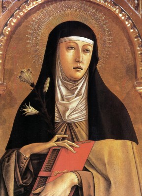 이 작품은 후기 고딕의 장식성과 초기 르네상스적 사실성이 공존하는 과도기 양식을 보여 준다. 금박 배경은 중세 제단화의 초월적 공간을 유지하지만, 인물의 얼굴과 손은 섬세한 명암 표현으로 입체감을 얻는다. 성녀가 든 백합은 순결과 봉헌을, 붉은 책은 수도 규칙과 영적 지혜를 상징한다. 크리벨리는 전통적 상징 체계를 유지하면서도 인물의 물질성과 세부 묘사를 강화하여 성인을 보다 구체적 존재로 제시한다. 이는 15세기 이탈리아에서 성인을 초월적 상징에서 점차 인격적 신앙 모델로 인식하던 변화와 연결된다. 이 성화는 교회 제단 앞에서 신자들이 성녀의 모범을 묵상하도록 구성된 전통적 경배 도상이다.