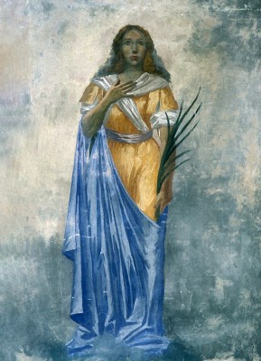 • 한 손에 든 종려가지와 다른 손의 검이 순교의 상징을 명확히 제시한다.