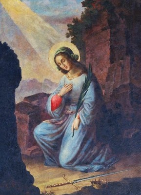 • 손에 든 종려가지와 바닥에 놓인 검과 왕관이 순교와 세속 권력의 거부를 상징한다.