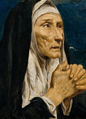 작가 : 미하엘 빌만(Michael Willmann) 연대 : 17세기 후반 소장 : 브로츠와프 국립미술관(National Museum in Wrocław), 폴란드 기법·시대 : 유화, 바로크 시대 유형 : 성인 단독상(기도하는 성녀 도상) 특징 : • 성녀 모니카는 눈물을 훔치는 순간으로 포착되어 평생 이어진 눈물의 기도를 직접적으로 드러낸다. • 어두운 배경 속에서 얼굴과 손, 흰 천만을 강조한 명암 대비는 바로크 회화 특유의 감정 집중 효과를 만든다. • 위로 향한 시선은 인간적 슬픔을 넘어 하느님께 향한 신뢰와 간청을 상징한다. • 소박한 복식과 노년의 얼굴 표현은 이상화된 성인상보다 신앙의 진실성과 고통의 깊이를 강조한다. ※ 이 작품은 바로크 미술의 감정적 표현과 강한 명암 대비를 통해 성녀 모니카의 내적 고통과 신앙을 극적으로 드러내는 성화이다. 미술사적으로 바로크 회화는 인간의 감정과 신앙 체험을 생생하게 표현하는 데 특징이 있으며, 작가는 어두운 배경 속에서 눈물과 손의 움직임을 강조하여 관람자의 시선을 인물의 내면에 집중시키려 한다. 작가의 의도는 모니카의 삶을 단순한 교훈적 상징이 아니라 실제 인간의 고통과 간절한 기도의 체험으로 드러내는 데 있으며, 눈물을 훔치는 순간을 포착함으로써 기도의 지속성과 인내를 표현한다. 신앙적 측면에서 이 성화는 아들 성 아우구스티노의 회심을 위해 평생 기도한 어머니의 믿음을 묵상하게 하며, 인간의 눈물 속에서도 하느님을 향한 희망과 신뢰가 살아 있음을 보여 주는 영적 메시지를 전한다.