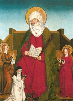 작가 : 작자 미상 연대 : 중세 후기(추정) 소장 : 독일 트라이스 성 요한 세례자 교회(Church of St. John the Baptist, Treis) 기법·시대 : 벽화(프레스코/템페라 계열), 중세 종교미술 유형 : 성인 단독상 특징 : • 성녀는 책을 들고 고개를 숙인 자세로 묘사되어 평생의 기도와 묵상을 상징한다. • 금색 후광과 장식 띠는 성인의 거룩함을 강조하면서도 평면적 구성으로 상징성을 강화한다. • 단순화된 형태와 선명한 색면은 교회 내부 장식 성화의 교육적·신심적 목적을 드러낸다. • 절제된 표정과 안정된 구도는 감정보다 덕성과 신앙의 지속성을 강조한다. ※ 이 작품은 중세 교회 벽화 전통 속에서 성녀 모니카를 공동체 신앙의 모범으로 제시한 성화이다. 미술사적으로 중세 성화는 사실적 묘사보다 상징성과 교육적 기능을 중시하며, 평면적인 색면과 단순화된 형태를 통해 신앙의 의미를 명확하게 전달하는 특징을 지닌다. 작가는 이러한 양식을 통해 성녀의 개인적 감정보다 기도와 인내라는 덕목을 강조하려 하며, 책과 숙인 자세를 통해 묵상과 간청의 삶을 상징적으로 표현한다. 신앙적 측면에서 이 성화는 아들 성 아우구스티노의 회심을 위해 끊임없이 기도했던 어머니의 믿음을 공동체가 본받아야 할 모범으로 제시하며, 교회 안에서 지속되는 기도와 신뢰의 신앙을 묵상하게 하는 영적 메시지를 전한다.