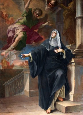 작가 : 피에트로 마지(Pietro Maggi) 연대 : 1714년 소장 : 이탈리아 밀라노 산 마르코 성당(San Marco), 오른쪽 익랑 성 아우구스티노 경당 기법·시대 : 유화, 후기 바로크 유형 : 성인 서사 장면(환시 장면) 특징 : • 하늘에서 내려오는 천사의 역동적인 동작과 성녀의 개방된 몸짓이 바로크 특유의 극적 순간성을 형성한다. • 성녀 모니카의 시선과 손짓은 하느님의 응답을 받아들이는 경외와 신뢰를 강조한다. • 고전적 건축 배경과 원근 처리로 지상과 천상의 공간을 대비시킨다. • 빛의 집중과 색채 대비는 환시의 초월성과 신적 개입을 시각적으로 부각한다. ※ 이 작품은 후기 바로크 회화의 특징인 역동적인 구성과 강한 빛의 대비를 통해 성녀 모니카의 기도와 그에 대한 하느님의 응답을 극적으로 표현한 성화이다. 미술사적으로 바로크 미술은 신앙의 체험을 감정적이고 극적인 장면으로 표현하여 관람자가 사건의 현장에 참여하는 듯한 몰입을 유도하는 특징을 지닌다. 작가는 하늘에서 내려오는 천사의 움직임과 성녀의 몸짓을 통해 기도의 순간이 신적 계시로 이어지는 장면을 강조하려 하며, 빛의 집중을 통해 천상과 지상의 만남을 시각적으로 드러낸다. 신앙적 측면에서 이 성화는 오랜 인내와 눈물의 기도로 아들 성 아우구스티노의 회심을 간청했던 성녀 모니카의 믿음을 묵상하게 하며, 하느님께 대한 지속적인 간구가 결국 신적 섭리 안에서 응답된다는 희망과 신뢰의 메시지를 전한다.