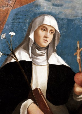 작가 : 팔마 일 베키오(Palma il Vecchio) 연대 : 1510–1520년경 소장 : 아카데미아 카라라 미술관(Accademia Carrara), 베르가모 기법·시대 : 유화, 베네치아 르네상스 유형 : 성인 단독상 특징 : • 성녀 모니카는 단정한 수도복 차림으로 묘사되어 외적 장식보다 내적 신심과 절제를 강조한다. • 한 손에 든 책은 신앙과 묵상을, 다른 손에 가까이 제시된 심장은 어머니로서의 사랑과 기도의 열정을 상징한다. • 부드러운 색조와 안정된 구도는 베네치아 르네상스 특유의 온화하고 인간적인 성인 표현을 보여준다. • 배경의 십자가와 자연 요소는 고난과 구원을 함께 암시하며 성녀의 삶을 신앙적 맥락 속에 위치시킨다. ※ 이 작품은 베네치아 르네상스 회화의 부드러운 색채와 안정된 구도를 통해 성녀 모니카를 인간적이고 묵상적인 성인의 모습으로 표현한 성화이다. 미술사적으로 베네치아 화파는 강한 극적 효과보다 색채와 분위기를 통해 인물의 내면을 드러내는 특징을 지니며, 작가는 이러한 양식을 통해 성녀의 조용한 신앙을 강조한다. 작가의 의도는 눈물의 기도로 알려진 모니카의 삶을 격렬한 감정 표현이 아니라 차분한 묵상과 신뢰의 태도로 보여 주는 데 있으며, 책과 심장이라는 상징을 통해 어머니의 사랑과 지속적인 기도를 시각화한다. 신앙적 측면에서 이 성화는 아들 성 아우구스티노의 회심을 위해 인내하며 기도했던 어머니의 믿음을 묵상하게 하며, 하느님께 대한 신뢰 속에서 이루어지는 조용한 기도의 힘을 드러내는 영적 메시지를 전한다.