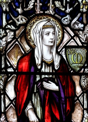 작가 : 작자 미상 연대 : 19세기 말–20세기 초 추정 소장 : 미국 뉴욕주 올버니 자비의 수녀회 수녀원 경당(Convent Chapel of the Sisters of Mercy, Albany, NY) 기법·시대 : 스테인드글라스, 근대 종교미술 유형 : 성인 단독상 특징 : • 성녀는 후광을 두른 반신상으로 표현되어 성인의 거룩함과 중보자의 역할을 강조한다. • 붉은 망토와 보라색 옷의 대비는 사랑과 고통, 인내의 기도를 상징적으로 결합한다. • 손을 가슴에 얹은 자세는 아들의 회심을 위해 바친 끊임없는 간구와 내적 신앙을 드러낸다. • 주변의 장식 문양과 방패 문장은 경당용 스테인드글라스의 교육적·기념적 성격을 보여준다. ※ 이 작품은 19–20세기 교회 장식미술 전통 속에서 제작된 스테인드글라스 성화로, 빛을 통과시키는 색유리를 통해 성인의 영적 의미를 드러내는 특징을 지닌다. 미술사적으로 이러한 스테인드글라스는 예배 공간 안에서 신앙 교육과 묵상을 돕기 위해 사용되며, 단순화된 형태와 상징적 색채로 인물의 덕성을 강조한다. 작가는 붉은 망토와 보라색 의복, 가슴에 얹은 손의 제스처를 통해 성녀 모니카의 모성적 사랑과 인내의 기도를 상징적으로 표현하려 한다. 신앙적 측면에서 이 성화는 아들 성 아우구스티노의 회심을 위해 평생 눈물로 기도했던 어머니의 믿음을 묵상하게 하며, 빛 속에 드러나는 성인의 모습은 공동체가 이어가야 할 기도와 희망의 신앙을 상징적으로 보여 준다.