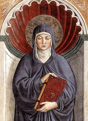 작가 : 베노초 고촐리(Benozzo Gozzoli) 연대 : 1464–1465년 소장 : 이탈리아 산지미냐노 성 아우구스티노 성당 후진 경당(Sant’Agostino, San Gimignano) 기법·시대 : 프레스코, 초기 르네상스 유형 : 성인 단독상 특징 : • 성녀는 정면에 가까운 안정된 자세로 성서를 들고 있어 기도와 말씀에 뿌리내린 삶을 상징한다. • 단정한 수도복과 절제된 표정은 감정의 과장보다 영적 집중과 인내를 강조한다. • 붉은 부채형 장식과 후광은 성인의 존엄과 거룩함을 시각적으로 부각한다. • 명확한 윤곽과 균형 잡힌 색채는 고촐리 특유의 서사적이면서도 질서 있는 초기 르네상스 양식을 보여준다. ※ 이 작품은 초기 르네상스 프레스코 전통 속에서 성녀 모니카를 관조와 묵상의 인물로 표현한 성화이다. 미술사적으로 베노초 고촐리는 명확한 윤곽과 조화로운 색채를 통해 인물의 존엄성과 서사적 질서를 드러내는 화가로 알려져 있으며, 이 작품에서도 안정된 구도와 단순한 상징을 통해 인물의 영적 의미를 강조한다. 작가의 의도는 성녀 모니카의 삶을 극적인 사건이 아닌 기도와 말씀 속에서 형성된 신앙의 여정으로 보여 주는 데 있으며, 성서를 든 손과 절제된 자세는 인내와 묵상의 덕성을 상징적으로 드러낸다. 신앙적 측면에서 이 성화는 아들 성 아우구스티노의 회심을 위해 오랜 세월 기도했던 어머니의 믿음을 묵상하게 하며, 공동체가 본받아야 할 지속적인 기도와 신뢰의 신앙을 보여 주는 영적 메시지를 전달한다.