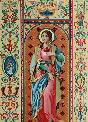 작가 : 작자 미상 (Unknown) 연대 : 19세기 소장 : 미상 기법·시대 : 채색 인쇄, 장식 삽화 양식 유형 : 성인 성상화 특징 : • 중앙의 성녀를 중심으로 대칭적인 장식 테두리가 화면을 구성하여 장식성과 상징성을 강조한다. • 붉은 의상과 푸른 망토의 대비는 순교와 신앙의 충실함을 시각적으로 드러낸다. • 손에 든 십자가는 순교자의 정체성을 직접적으로 나타낸다. • 주변의 식물과 동물 문양은 낙원적 질서와 조화로운 창조 세계를 상징적으로 배치한다. ※ 이 작품은 19세기 종교 삽화 양식 속에서 성녀 수산나를 장식적이고 상징적인 도상으로 제시하며, 작가는 세밀한 문양과 대칭적 구성을 통해 개인적 감정보다 신앙의 보편성과 질서를 강조하고, 성녀의 단순하고 정적인 자세를 통해 순교가 극적 사건이 아니라 하느님께 향한 일관된 태도로 지속됨을 드러낸다.
