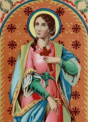작가 : 작자 미상 (Unknown) 연대 : 19세기 소장 : 미상 기법·시대 : 채색 인쇄, 장식 삽화 양식 유형 : 성인 성상화 특징 : • 인물의 상반신을 중심으로 한 단순한 구도는 성녀의 내적 상태에 시선을 집중시킨다. • 원형 후광과 반복되는 장식 문양은 초월성과 성스러운 질서를 강조한다. • 붉은 의상과 푸른 망토의 대비는 순교와 신앙의 충실함을 상징적으로 드러낸다. • 가슴에 가까이 들고 있는 십자가는 신앙의 중심이 외적 행위가 아니라 내적 결단임을 나타낸다. ※ 이 작품은 19세기 종교 삽화 양식의 단순화된 형식 속에서 성녀 수산나를 장식적 상징으로 제시하며, 작가는 반복되는 문양과 절제된 표정을 통해 감정의 극적 표현을 배제하고 신앙이 내면에서 지속되는 태도임을 드러내고, 십자가를 가슴에 가까이 둔 구성을 통해 순교가 외적 사건이 아니라 내적 결단의 완성으로 이해되도록 이끈다.