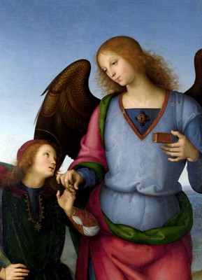 ※ 이 작품은 이탈리아 르네상스 회화가 지닌 균형 잡힌 구도와 이상화된 인물 표현을 통해 성서 서사를 조화롭고 명상적인 장면으로 제시하는 사례이다. 페루지노는 라파엘이 토비아의 손을 이끄는 동작을 중심으로 인간의 여정 속에 동행하는 천사의 역할을 강조하고자 하였으며, 안정된 삼각 구도와 맑은 풍경을 통해 장면 전체에 평화로운 질서를 부여하였다. 이러한 표현은 천사를 두려움의 대상이 아니라 인간을 보호하고 인도하는 하느님의 사자로 이해하는 신앙적 관점을 드러내며, 하느님의 섭리가 인간의 삶 속에서 조용히 함께한다는 의미를 묵상하도록 이끈다.
