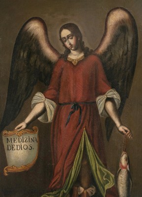 ※ 이 작품은 라틴아메리카 식민지 종교미술 전통 속에서 성 라파엘 대천사를 치유와 보호의 상징으로 강조한 성화이다. 작가는 정면 구도와 상징적 요소들을 통해 라파엘을 하느님의 치유를 전달하는 사자로 분명히 제시하고자 하였으며, 물고기와 문구를 결합하여 「토비트기」의 치유 서사를 시각적으로 명확하게 드러낸다. 이러한 표현은 성화를 신앙 교육과 신심 고양의 도구로 사용했던 식민지 바로크 미술의 특징을 보여 주며, 관람자로 하여금 하느님의 치유와 보호가 인간 삶 속에 함께한다는 신앙적 의미를 묵상하도록 이끈다.