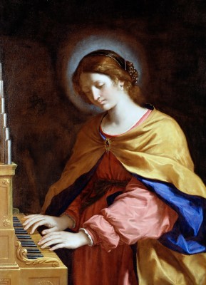 작가 : 구에르치노(Guercino, Giovanni Francesco Barbieri) 연대 : 1649년 소장 : 덜위치 픽처 갤러리(Dulwich Picture Gallery), 런던 기법·시대 : 유채, 이탈리아 바로크 유형 : 성인 단독상(음악 성인상) 특징 : • 오르간 앞에 앉아 고개를 숙인 채 연주에 몰입한 모습으로 묘사된다. • 부드러운 명암과 절제된 색채가 구에르치노 특유의 바로크 양식을 보여준다. • 성녀의 고요한 자세는 내적 침묵과 관상적 기도를 강조한다. • 은은한 성광은 성녀의 거룩함과 영적 집중을 드러낸다. • 화면 전체의 차분한 분위기는 음악을 통한 영적 찬미의 의미를 강조한다. ※ 본 작품은 이탈리아 바로크 회화 전통 안에서 명암 대비와 감정의 절제를 통해 성인의 내적 신앙을 표현하는 미술사적 특징을 보여준다. 작가는 오르간 앞에 몰입한 성녀의 조용한 자세와 부드러운 빛의 흐름을 통해 성녀 세실리아의 관상적 기도와 음악적 봉헌을 강조하였으며, 이러한 표현은 음악이 단순한 연주를 넘어 하느님께 드리는 영적 찬미와 기도의 행위임을 상징적으로 드러낸다.