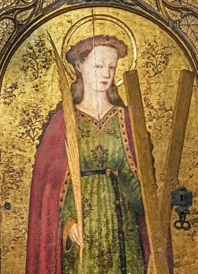 • 성녀는 십자가와 종려나무 가지를 함께 들고 있어 신앙 고백과 순교의 의미를 동시에 드러낸다.