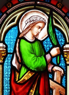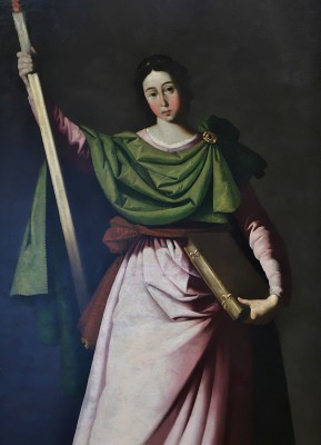 • 성녀는 종려나무 가지와 책을 함께 들고 서 있어 순교자이자 신앙의 증인으로 제시된다.