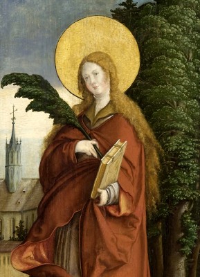 ※ 본 작품은 메스키르히 제단화 연작의 일부로서 종교개혁기 독일 가톨릭 미술이 강조한 성인 공경의 의미를 시각적으로 제시하는 성화에 해당한다. 작가는 안정된 구도와 명확한 상징을 통해 성녀 에울라리아를 순교와 신앙의 증인으로 제시하고자 하였으며, 이러한 표현은 교회의 전통과 성인의 모범을 묵상하도록 이끄는 신앙적 의미를 드러낸다.