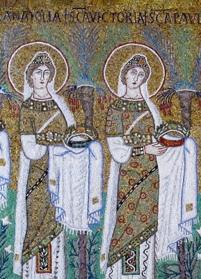 ※ 이 작품은 초기 비잔틴 모자이크의 전형으로, 개별적 인물 묘사보다 교회 공동체 안의 영광을 강조하는 미술사적 특징을 보여준다. 작가는 원근이나 감정 표현을 최소화하고, 황금 배경과 반복적 배열을 통해 천상 예루살렘의 질서를 시각화한다. 성녀 빅토리아는 개인적 영웅이 아니라, 동정 순교자들의 무리 안에서 영광에 참여한 존재로 제시된다. 신앙은 개별 사건의 드라마가 아니라, 순교자들의 행렬 속에 편입되는 영원한 승리의 상태로 표현된다.