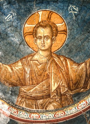 ※ 이 작품은 14세기 비잔틴 후기 프레스코 전통 속에서 제작된 것으로, 장식성과 상징성이 유지되면서도 보다 인간적인 얼굴 표현이 강조되던 시기의 특징을 반영한다. 작가는 정면성과 대칭적 구도를 통해 그리스도를 영원한 질서의 중심으로 제시하면서, 동시에 부드러운 표정과 인체 비례를 통해 신성과 인간성이 함께 드러나도록 의도하였다. 이러한 표현은 신앙을 초월적 존재에 대한 경외와 더불어, 인간과 관계 맺는 하느님의 현존으로 이해하도록 이끈다.